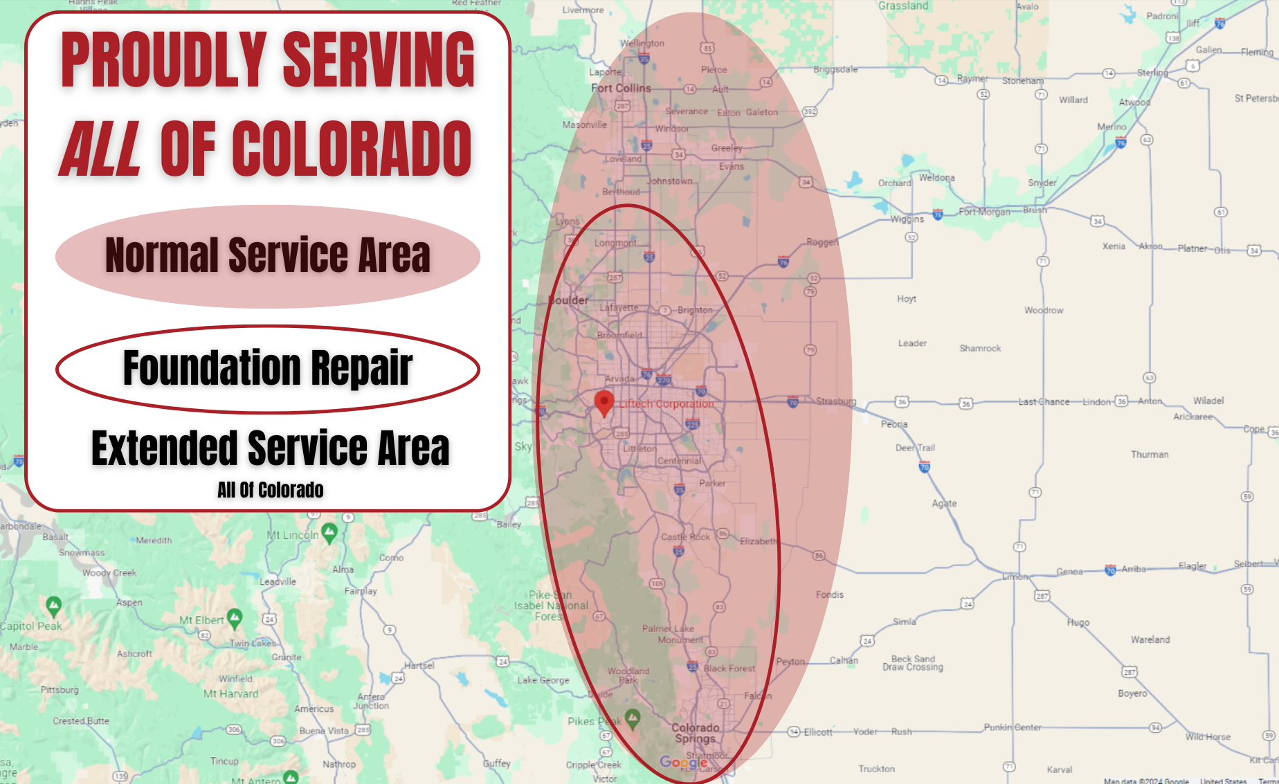 Liftech also extends service to all of Colorado in our Extended Service Area. For those outside the normal service area in Colorado, please provide good pictures and description of the repair needs to receive an accurate digital estimate via our online request form.